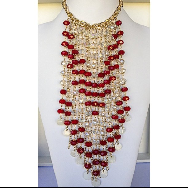 Colar em metal dourado, com cristais verdadeiros vermelhos, pingente com strass, e gotas acrílicas vinho.